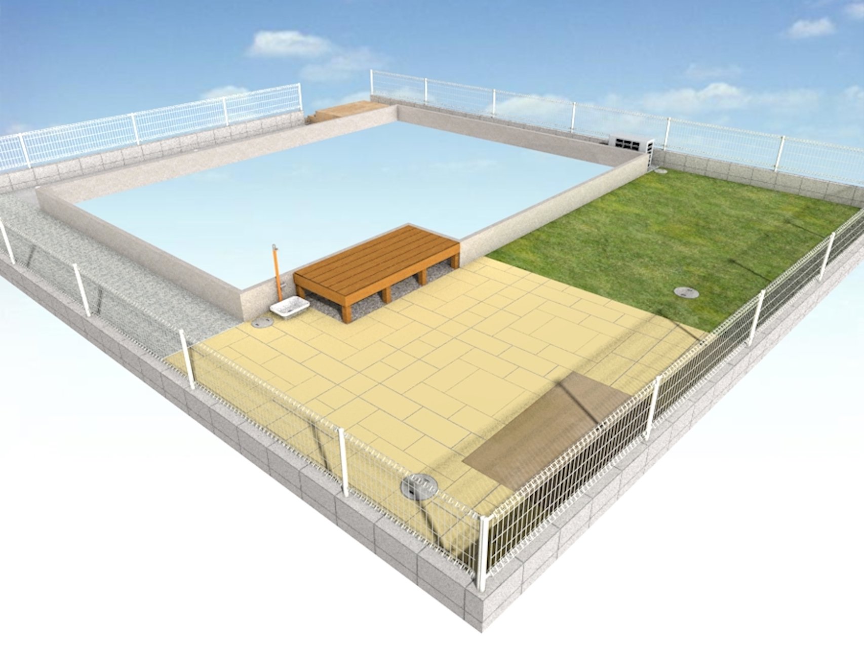 中庭に自然石ミストラルイエローのテラスと芝を張り子供と遊べるスペースを作りました。少しだけですが、菜園も作りましたがこの広さでもトマトやオクラが沢山収穫できます。
