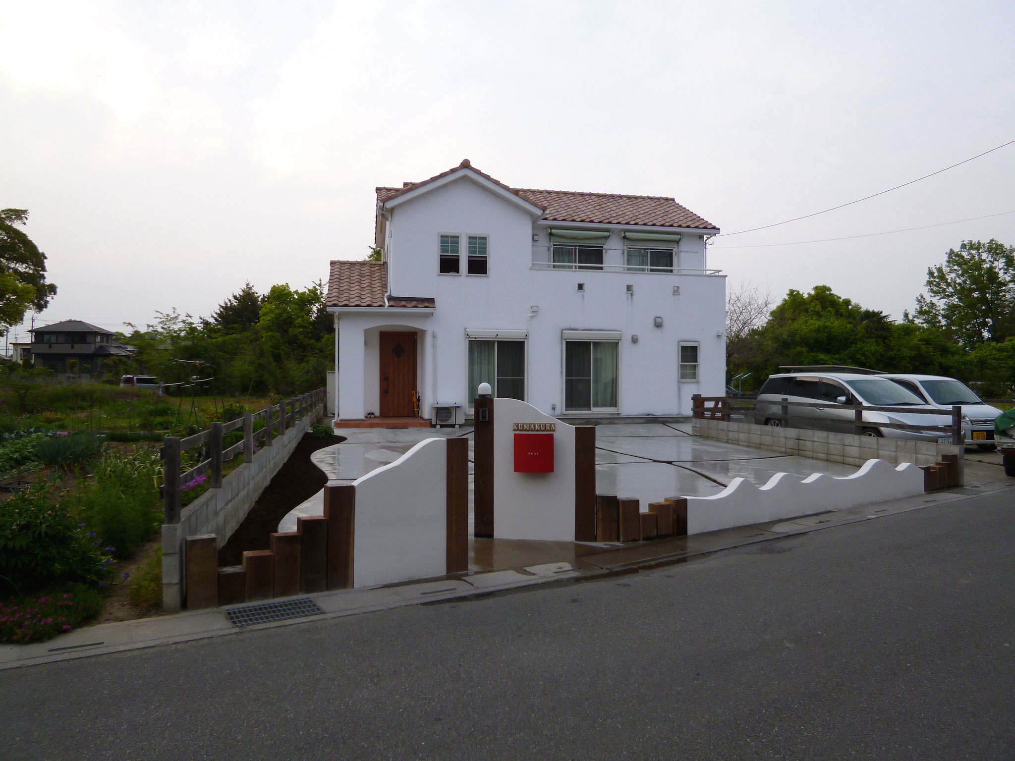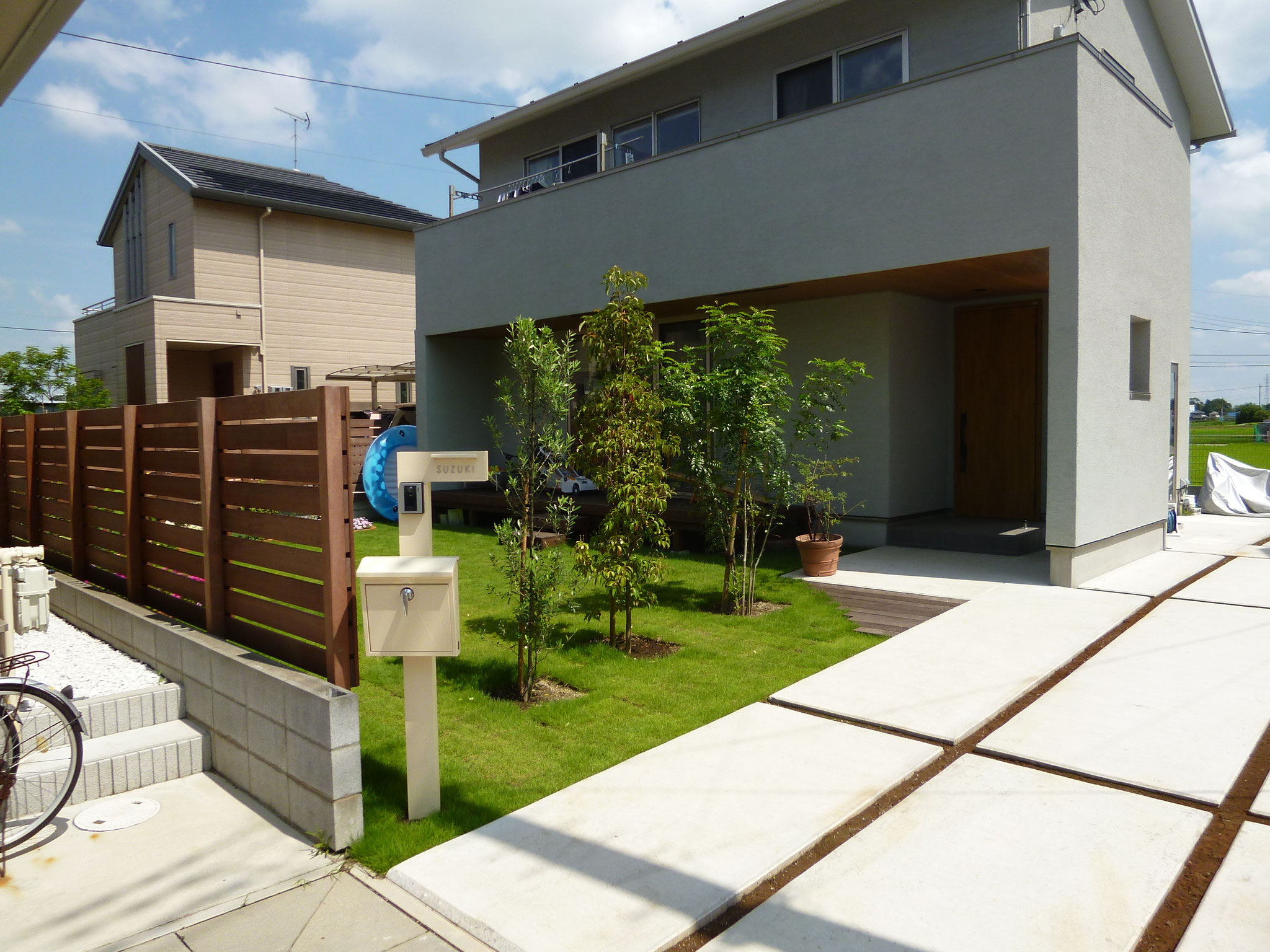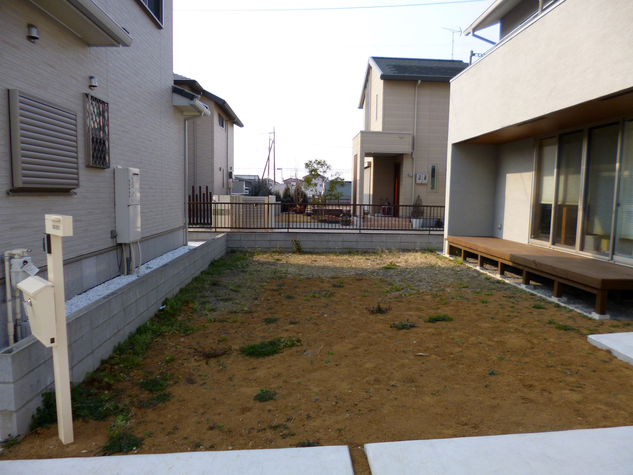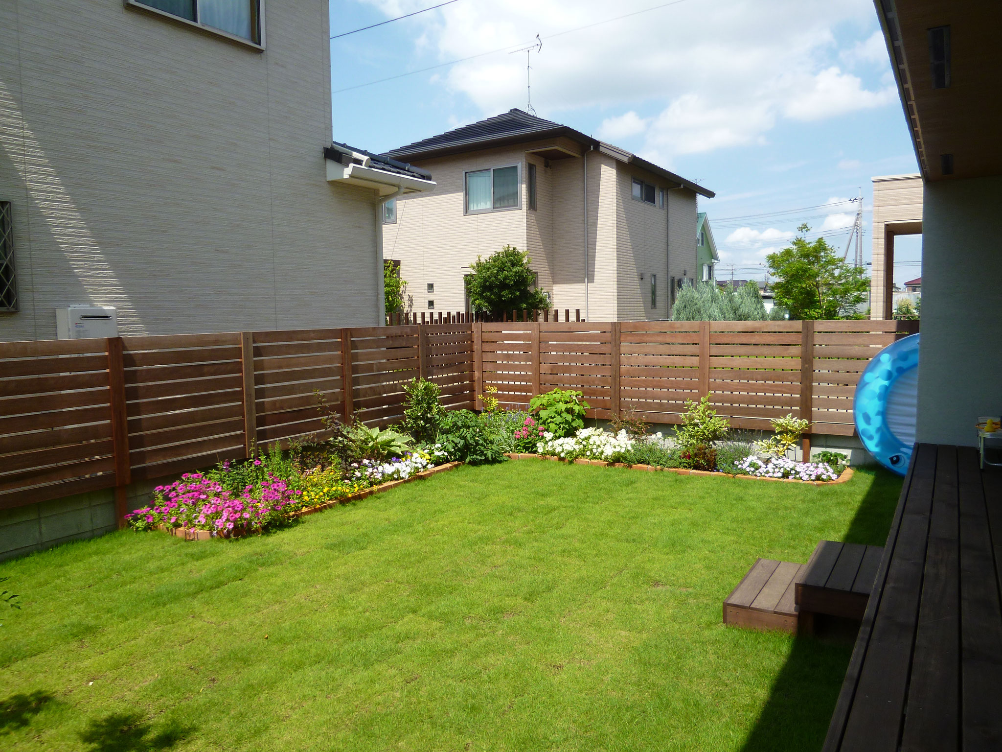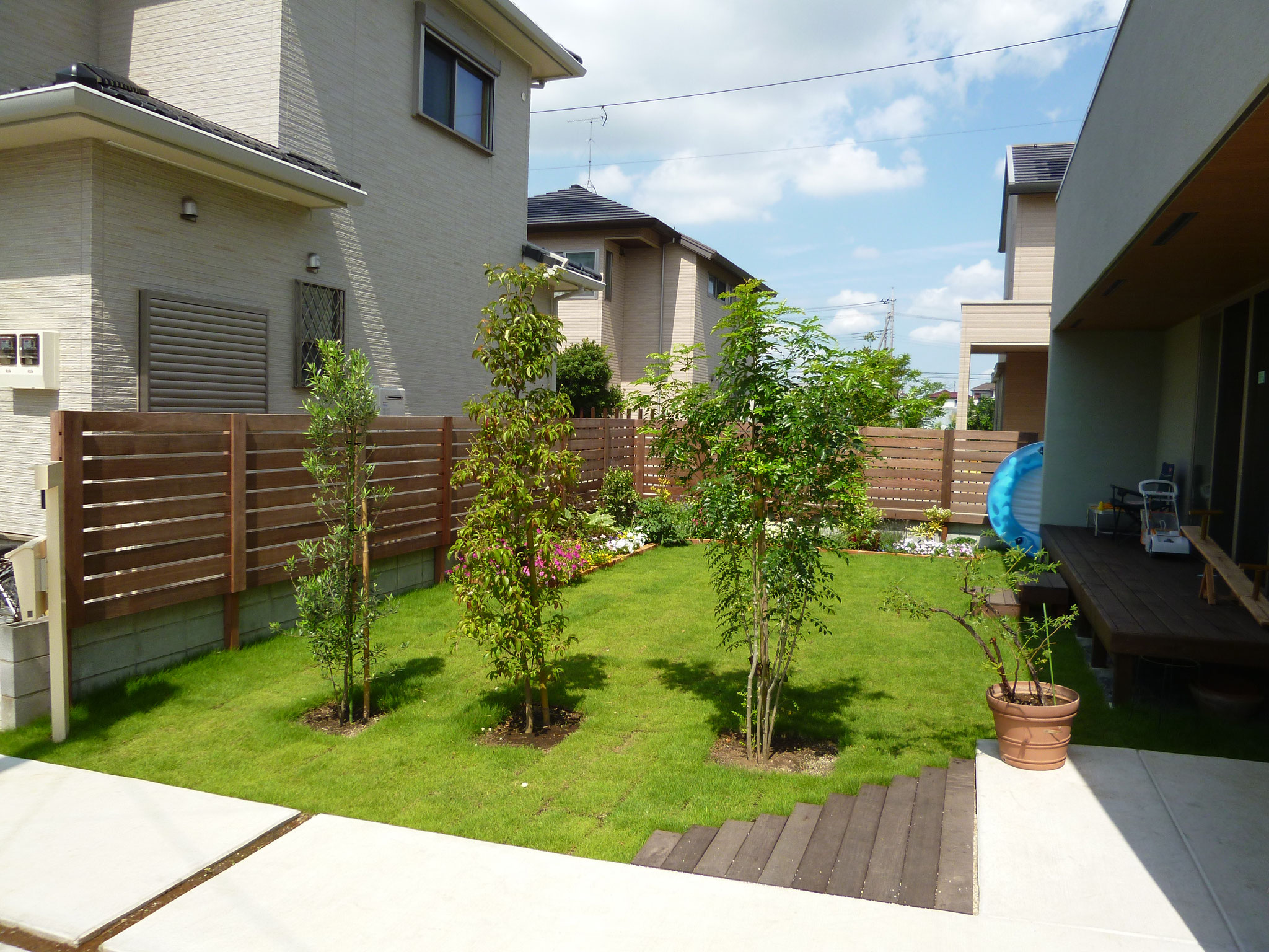 周りの目隠しはウッドフェンスで、丸見えのリビングは植栽でうまく隠せました。せっかくの広いお庭も見えすぎで、来客の方からもリビングが丸見えでした。