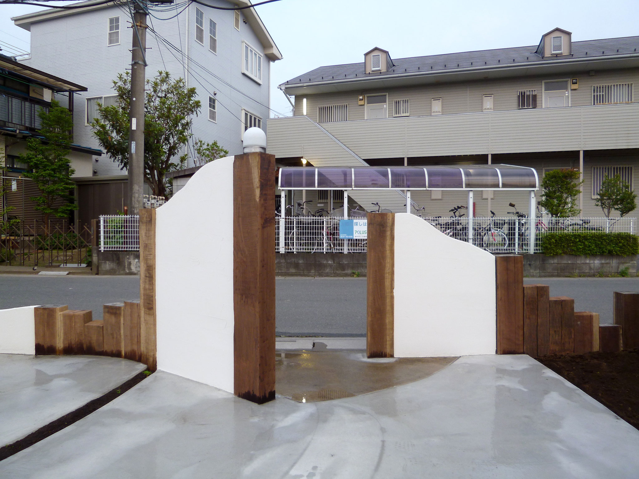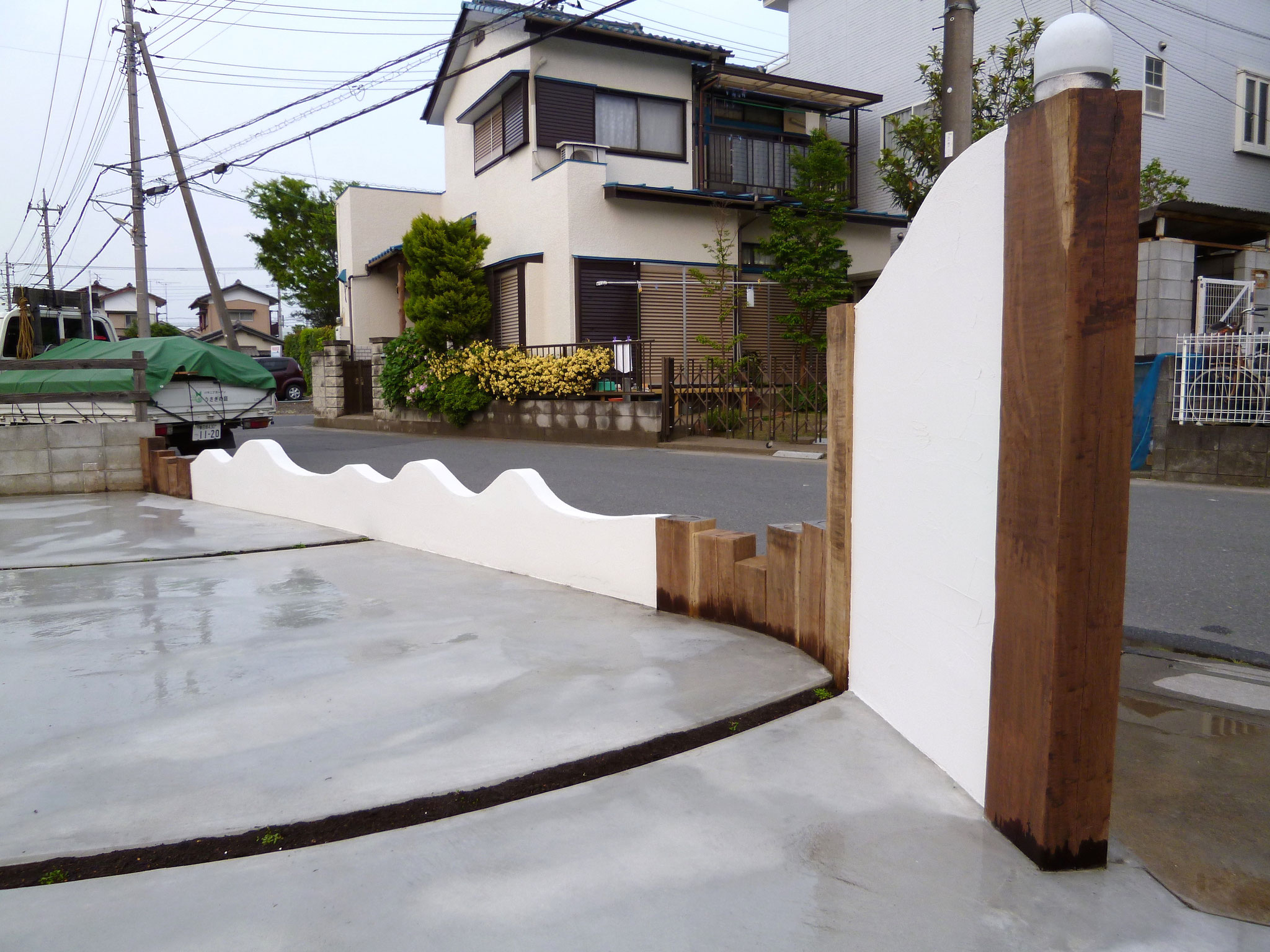 傷んでいた枕木も新品に交換して、塗り壁も可とう性低汚染タイプのジョリパットJQ650で塗り直しました。