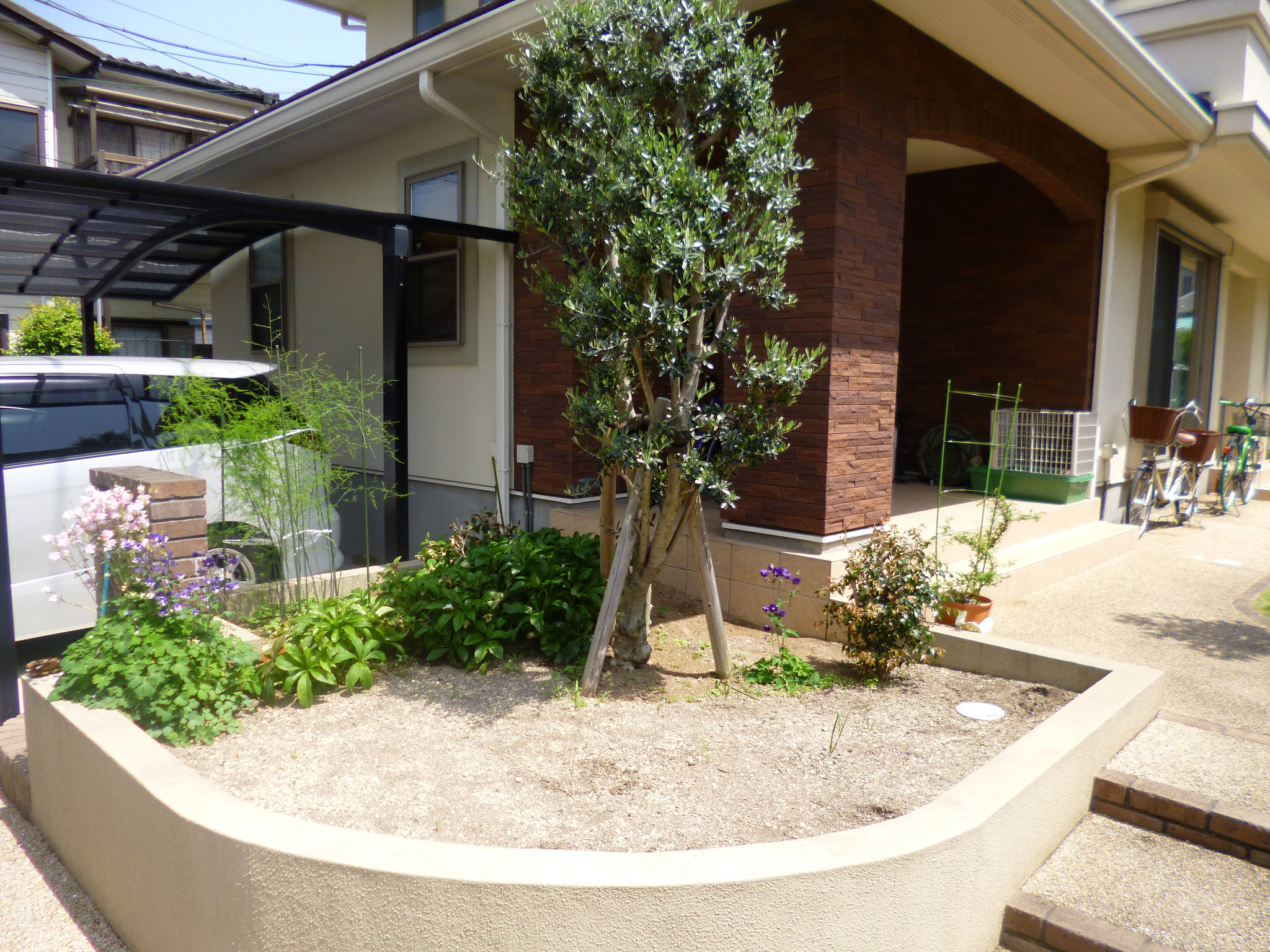 アプローチ横の植栽スペースを模様替えしました。数年前に作った庭ですが、バランスが崩れてきたのでメインのオリーブはそのままに、ご主人の大事な西洋オダマキ3種類もローズマリーやアスチルベ、カレックス、ペラルゴニューム他の植物とアレンジして植えました。