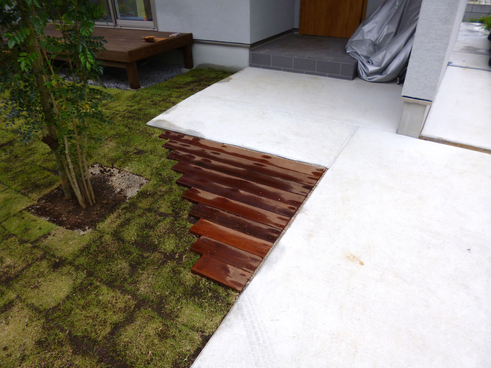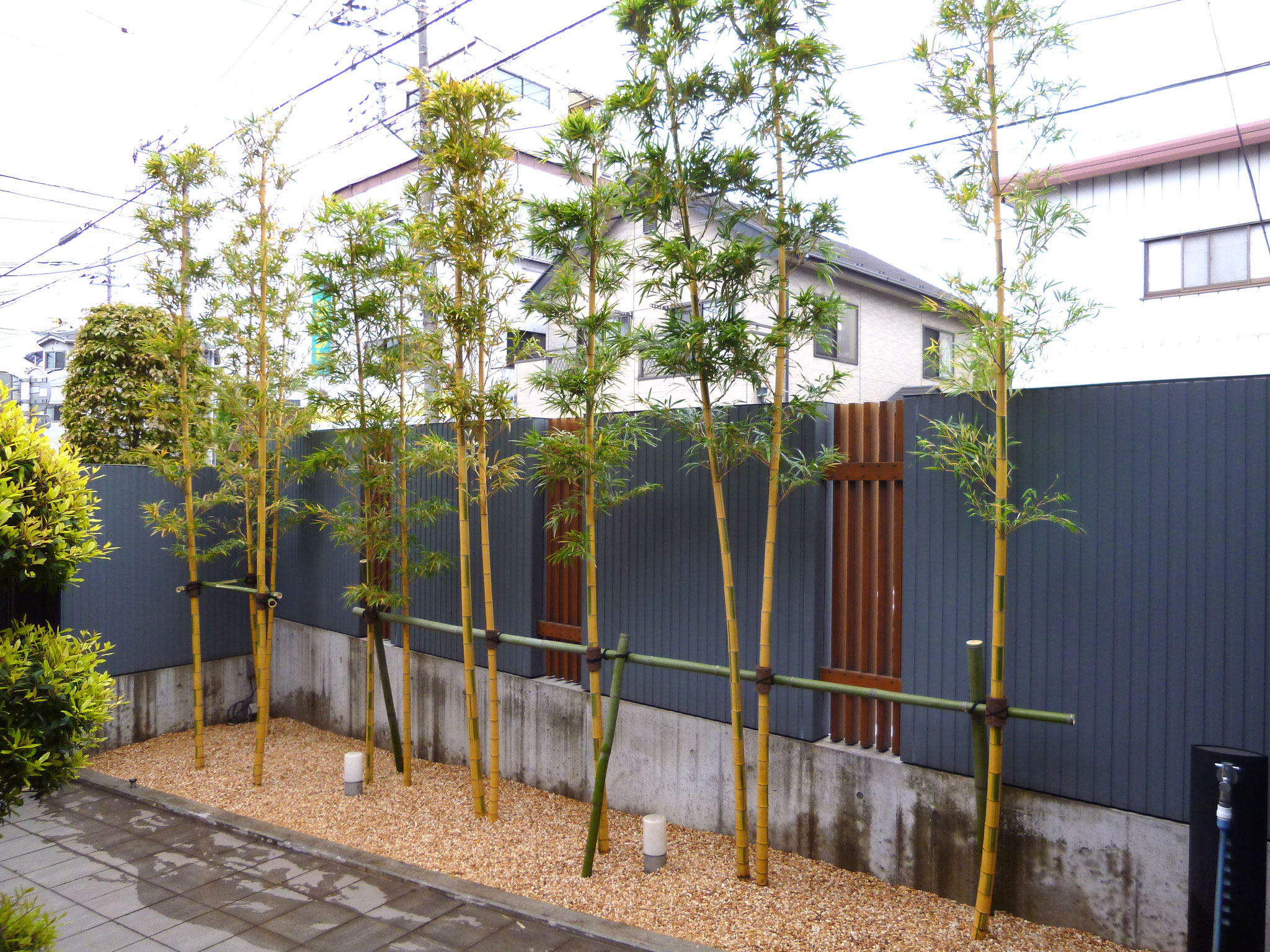 玄関にキンメイモウソウチクを植えました。グレーの縦目外壁デザインとの対比で一層綺麗な印象を与えます。土壌も入れ替え、明るめのサビ砂利で仕上げたので玄関が明るくなりました。