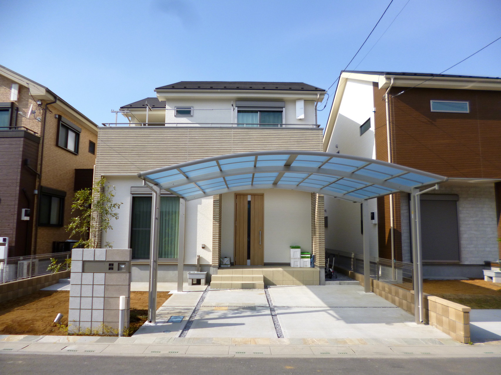 玄関ポーチの真ん前に駐車場がある為、屋根が高めのカーポートを設置しました。